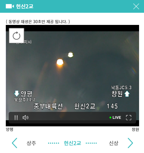 확인하고자 하는 고속도로 cctv를 선택하면 바로 팝업으로 실시간 cctv 영상을 볼 수 있습니다. 단, 제공되는 영상 길이는 30초만 제공되므로 현재의 교통상황 파악에 참고하시면 되겠습니다.