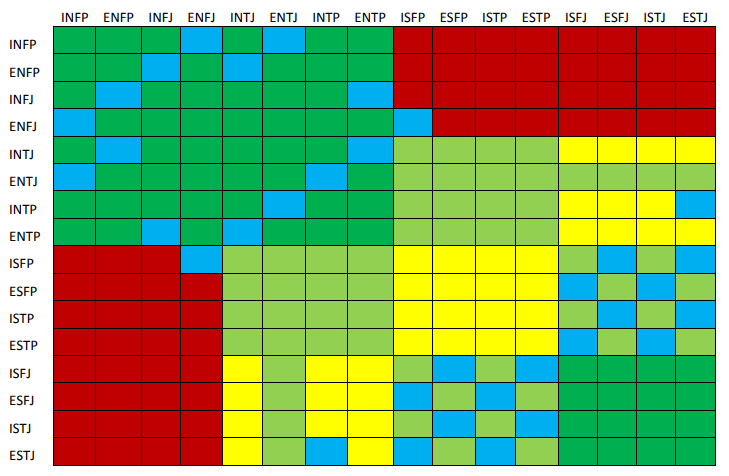 mbti 궁합표는 교차지점에서 나타내는 색깔에 따라 결과가 나뉘는데 결과값은 총 다섯가지 입니다.
