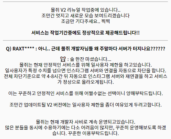 몰쥐에 올라온 운영자의 공지로 현재는 트래픽 부하 문제로 일 사용자에 제한을 둔 상태라고 합니다. 때문에 주말에는 검색자가 많은 탓에 주말에 이용하려면 사이트가 정상 작동을 안하는 경우가 종종 있습니다. 이는 처음 소개한 스토리 시그에서도 종종 나타나는 증상인데 이 역시 트래픽 문제로 제한을 걸어둔 것인지는 모르겠습니다.