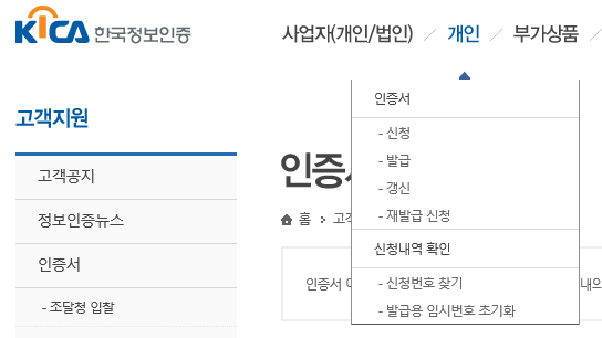 다음으로 이동한 화면에서 위쪽 메뉴 개인 > 인증서 > 갱신 메뉴를 선택해서 이동해주시구요.