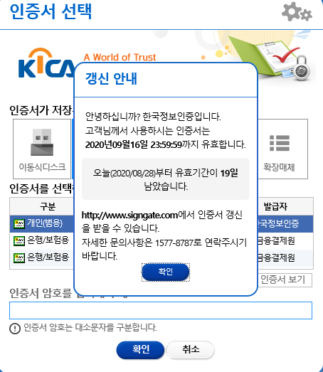 공인인증서 갱신은 최초 발급받았던 은행사이트에서도 갱신이 가능하지만 범용공인인증서의 경우는 조금씩 다를 수가 있습니다. 예시로 알려드리는 범용공인인증서는 사인게이트에서 발급한 인증서로 한국정보인증 사이트를 통한 범용공인인증서 갱신 방법에 대해서 알려드릴께요.