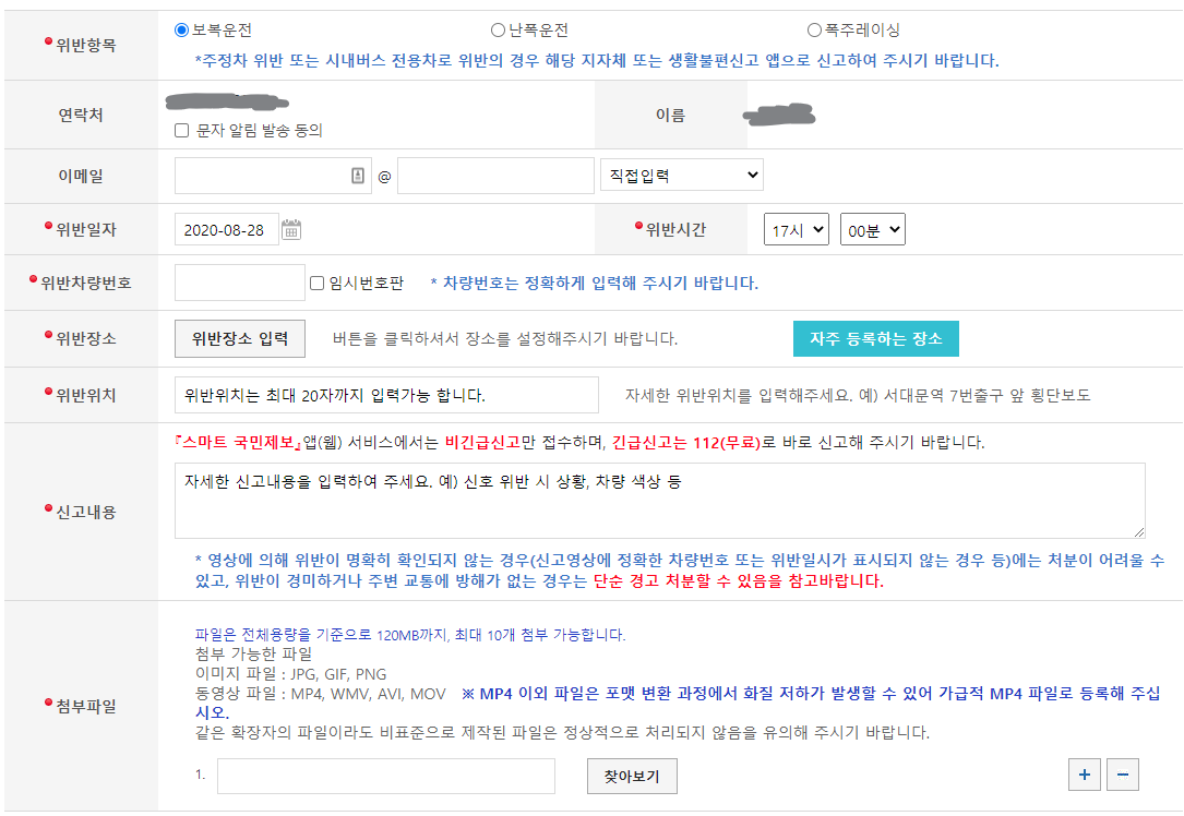 다음으로 위 화면에서 보복운전 신고가 가능한데 항목 앞에 빨간점으로 표시한 부분이 필수로 입력해야 하는 정보입니다. 위반항목을 보복운전을 선택하고 위반일자와 보복운전을 한 대상 차량의 차량번호, 위반장소와 신고 내용, 보복운전임을 입을 할 수 있는 사진이나 동영상 파일 첨부가 필요합니다.