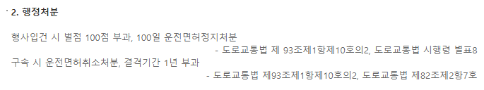 형사처분과 별개로 행정처분도 받게 되는데 형사입건의 경우 벌점 100점이 부과되고 100일 운전면허정지 처분을 받습니다. 또한 구속 시에는 운전면허취소 처분을 받고 시험응시에 대한 결격기간 1년이 부과됩니다.