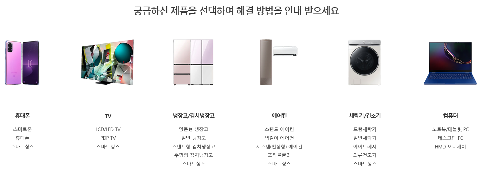 홈페이지 가운데에서 스마트폰 뿐 아니라 구형 핸드폰, 티비, 냉장고, 에어컨, 세탁기, 건조기, 컴퓨터, 노트북까지 선택하게끔 카테고리 분류가 되어있고, 각 제품에 대한 기술지원과 서비스예약까지 이곳 삼성전자 서비스 홈페이지에서 가능합니다.