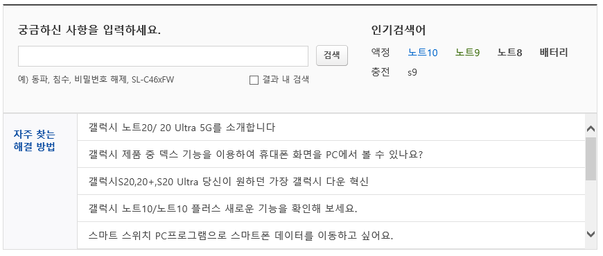 스마트폰에 대한 서비스 지원을 받기 위해 스마트폰을 눌러서 들어와보면 검색어 입력을 통해 이미 등록된 답변이나 정보를 찾아볼 수 있고, 자주 하는 질문 게시글을 이용해 스마트폰 증상에 대한 해결법을 알 수도 있습니다.