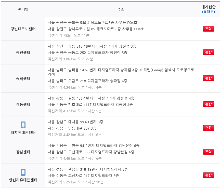 단, 각 서비스센터마다 수리가 가능한 품목들이 서로 다르고 운영시간도 각기 다르기 때문에 반드시 해당 서비스센터를 클릭하셔서 수리 가능제품과 운영시간을 미리 확인하셔야 합니다. 위 그림에서 휴대폰 표시가 되어있는 서비스센터의 경우 휴대폰, 태블릿, 갤럭시 워치 등 웨어러블 기기, 노트북 제품만 수리가 가능합니다.