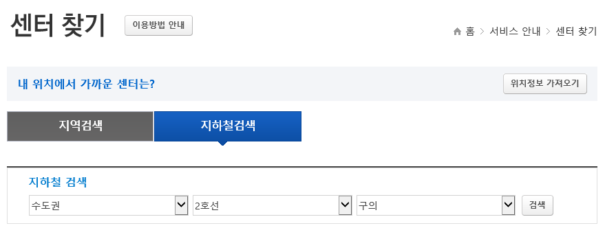 홈페이지 > 서비스 안내 > 센터찾기로 이동하여 삼성전자 서비스센터 위치를 조회하실 수 있습니다. 지역명이나 주소 검색을 하는 방법과 인근 지하철역 이름으로 검색하는 방법으로 가능하니 편한 방법으로 찾으시면 됩니다.