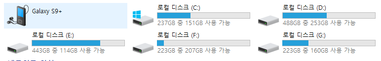 바로 이렇게 핸드폰 모델명으로 된 드라이브가 보이면 이 곳을 눌러서 폴더를 열어봅니다. 단, 이때 드라이브 안에 폴더가 안보인다면 스마트폰 화면에 데이터 접근 허용 여부를 묻는 창이 떠있을 테니 여기서 허용을 해주셔야 하구요.